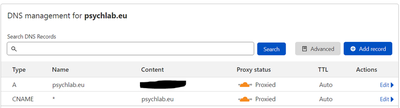 The only thing you should chose is wether you want this registry to be “Proxied” and “DNS Only”. This forum post describes the difference. The DNS proxied means it will be shown a Cloudflare IP if you look it up. Thus all attacks at that domain will DDoS Cloudflare and not you host directly. Non-proxied means all traffic goes directly to your own IP without Cloudflare being a safety net in front. The upside of proxied is that you will enjoy the Coudflare benefits, but you can not make a direct connection to your IP, which means any custom ports wont work. Non-proxied has the advantage of being able to use custom ports to connect as it will connect to your IP directly.