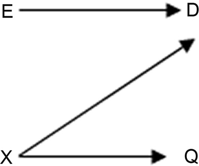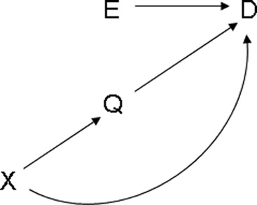 Causal interaction between the effects of E and Q on D without effect modification by Q of the effect of E on D. (VanderWeele, 2009).